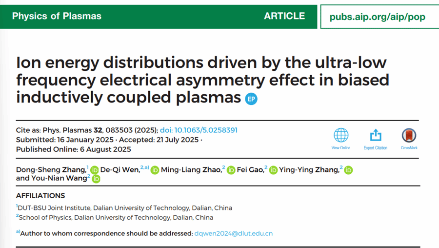 近日,我校中白学院2022级本科生张东升在偏压感性耦合等离子体离子能量调控的研究工作被国际等离子体物理领域主流期刊Phys. Plasma发表,并被编辑选为Editors’ Pick, 在杂志主页专栏刊载。论文题目为 “Ion energy distributions driven by the ultra-low frequency electrical asymmetry effect in biased inductively coupled plasmas”,其中张东升为第一作者;乐竟体育网页版的温德奇教授为通讯作者;乐竟体育网页版赵明亮博士后、高飞教授、张莹莹高级工程师和王友年教授为共同作者。