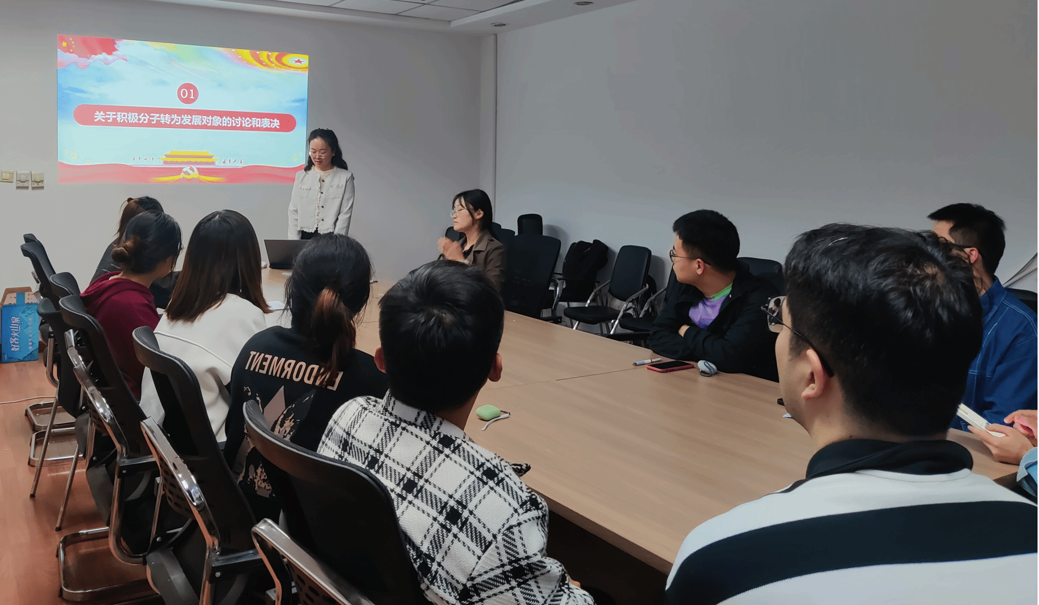 大会严格按照发展对象确立的程序进行,首先,由吕征、武宏两名同志依次上台发言,两位同志汇报了自己在积极分子期间的工作情况和学习成果,表达了入党的决心;接下来,其培养联系人对两名同志在成为积极分子期间的思想、学习、工作和生活等方面的表现进行总结评价,并就是否推荐他们为发展对象发表意见;参会党员和群众对吕征和武宏两名同志能否被列为发展对象进行了充分的讨论,并发表了自己的意见。接下来进行投票环节,支委会推荐监票人、计票人为郑祉溦同志和吕自微同志,经过参会同志无记名投票,一致同意将吕征、武宏两位同志列为发展对象。两位同志表示,能够被列为发展对象,他们觉得无比光荣,他们将以此刻作为新的起点,时刻以党员的标准严格要求自己,不断提升自己的科研能力和业务水平,不断提高自己的政治觉悟和理论素养。同时,两位同志也认识到了自己的不足,并表明了今后努力的方向。