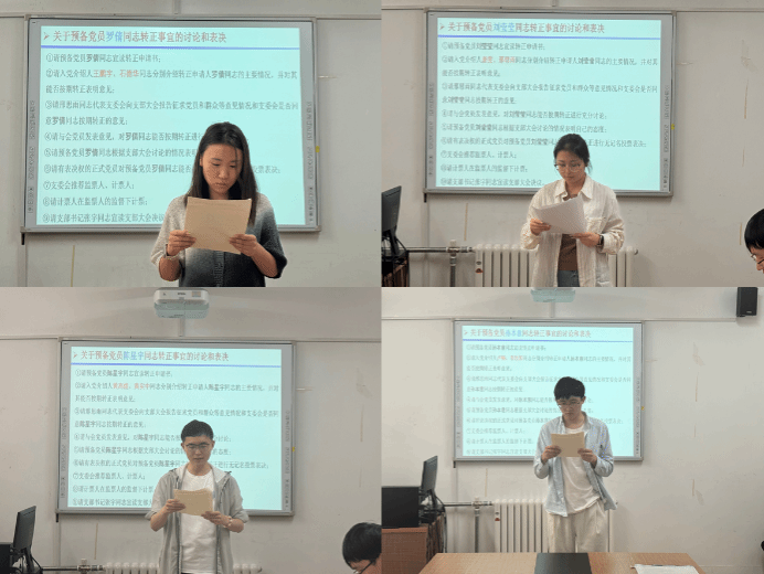 会议第二项,对中共预备党员罗倩、刘莹莹、陈星宇和孙本意四位同志转为中共正式党员的事宜进行讨论和表决。首先由罗倩、刘莹莹、陈星宇和孙本意四位同志分别宣读转正申请书,向大会汇报自己在预备期间的思想理论学习和工作生活情况,总结分析自己的优缺点,明确今后的发展方向,表明自己的入党决心。入党介绍人分别介绍转正申请人的主要情况,并对其能否按期转正表明意见。邢思雨同志宣读了支委会意见,与会党员发表了个人意见。经过无记名投票表决,一致同意罗倩同志、刘莹莹同志、陈星宇同志以及孙本意同志按期转为中共正式党员。