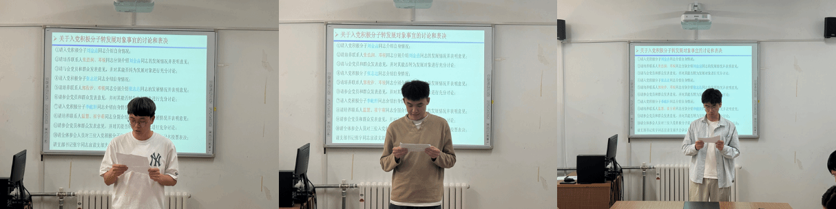 会议第三项,对将积极分子刘金垚、张志达和李屹轩三位同志列为发展对象的事宜进行讨论和表决。首先,由三位同志对自己的基本情况进行汇报,随后其培养人对他们在思想、学习等方面的表现进行介绍,在肯定他们表现的同时指出缺点,鼓励他们今后继续以积极的态度学习理论知识,不断提高思想觉悟。经全体参会党员和群众积极讨论和评议,最终通过无记名投票的方式同意将刘金垚、张志达和李屹轩三位同志列为发展对象。